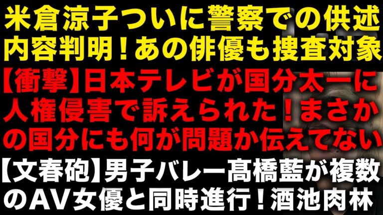 【衝撃】日本テレビの人権侵害に国分太一がガチギレ!何が問題だったか国分本人にも説明せず 米倉涼子の警察での供述内容出る 男子バレー髙橋藍の【文春砲】出る!インスタナンパし過ぎ (TTMつよし