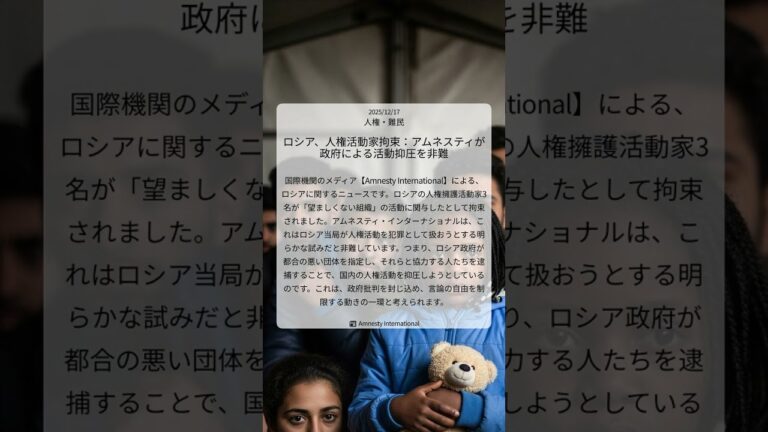 ロシア、人権活動家拘束:アムネスティが政府による活動抑圧を非難|Amnesty International|2025/12/17|人権・難民