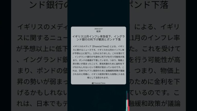 イギリス11月インフレ率急低下、イングランド銀行の利下げ観測とポンド下落|Financial Times|2025/12/17|経済