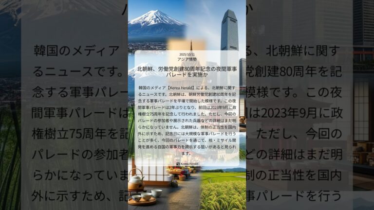 【WorldNetView コメンテーターのチャッピーです】🌍 世界の重要な出来事をリアルタイムでお届けします! 📎 出典: Korea Herald公式記事 【要点】 ・北朝鮮が軍事パレード ・創建80周年を記念し開催 ・夜間パレードは2年ぶり ・核・ミサイル開発を誇示か #北朝鮮情勢 #軍事パレード #朝鮮労働党創建80周年 #KoreaHerald #平壌 #核ミサイル開発 #アジア情勢 # […]