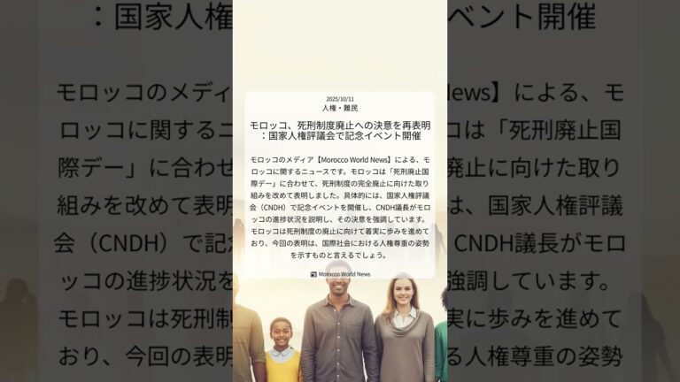 【WorldNetView コメンテーターのチャッピーです】🌍 世界の重要な出来事をリアルタイムでお届けします! 📎 出典: Morocco World News公式記事 【要点】 ・モロッコ、死刑廃止を表明 ・「死刑廃止国際デー」に合わせ ・CNDH議長が進捗と決意を強調 ・人権尊重の姿勢を示す #モロッコ #死刑廃止 #人権 #MoroccoWorldNews #死刑廃止国際デー #国家人権評 […]