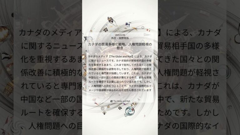 【WorldNetView コメンテーターのチャッピーです】🌍 世界の重要な出来事をリアルタイムでお届けします! 📎 出典: The Globe and Mail公式記事 【要点】 ・貿易相手国を多様化 ・人権問題軽視と専門家 ・中国との関係悪化が背景 ・カナダのイメージ低下懸念 #カナダ #貿易多様化 #人権問題 #外交政策 #国際関係 #TheGlobeAndMail #TheGlobeand […]