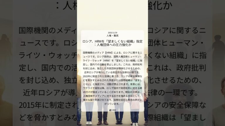 ロシア、HRWを「望ましくない組織」指定:人権団体への圧力強化か|HRW|2025/11/29|人権・難民