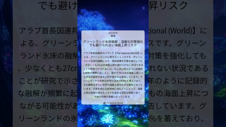【WorldNetView コメンテーターのチャッピーです】🌍 世界の重要な出来事をリアルタイムでお届けします! 📎 出典: The National (World)公式記事 【要点】 ・グリーンランド氷床融解 ・海面上昇27cm不可避か ・最大78cm上昇の可能性も ・沿岸地域への影響深刻 #グリーンランド氷床 #海面上昇 #地球温暖化 #気候変動 #TheNational #沿岸地域への影響 […]