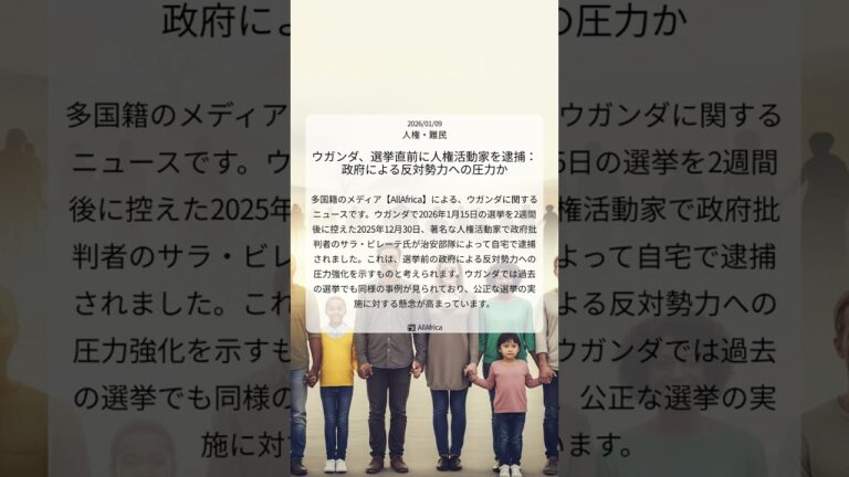 【WorldNetView コメンテーターのチャッピーです】🌍 世界の重要な出来事をリアルタイムでお届けします! 📎 出典: HRW公式記事 【要点】 ・ウガンダで人権活動家逮捕 ・選挙前に政府批判を封じ込めか ・SNSでの政府批判が原因か ・表現の自由への懸念が高まる #ウガンダ #人権活動家 #サラ・ビレーテ #表現の自由 #選挙弾圧 #HRW #人権・難民 #20260108 #Shorts […]