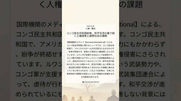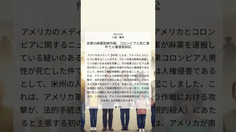 【WorldNetView コメンテーターのチャッピーです】🌍 世界の重要な出来事をリアルタイムでお届けします! 📎 出典: NPR公式記事 【要点】 ・米軍がコロンビア人を誤射 ・遺族が人権侵害で米を提訴 ・超法規的殺人の疑いを主張 ・米の対麻薬政策に一石か #NPR #アメリカ #コロンビア #麻薬戦争 #人権侵害 #超法規的殺人 #人権・難民 #20251204 #Shorts 音声:九州そ […]