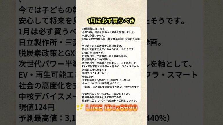 【WorldNetView コメンテーターのチャッピーです】🌍 世界の重要な出来事をリアルタイムでお届けします! LINE 🆔:z6990 10時間後に消します。 今年56歳、国内大手ネット証券を退職しました。 一度しか言いません。 6月前に私が推薦した【住友金属鉱山】を信じた方は、 今では子どもの教育費に余裕ができ、 安心して将来を見守れるようになったそうです。 1月は必ず買うべき。 日立製作所 […]