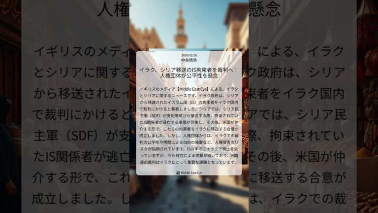 【WorldNetView コメンテーターのチャッピーです】🌍 世界の重要な出来事をリアルタイムでお届けします! 📎 出典: Middle East Eye公式記事 【要点】 ・イラク、IS拘束者を裁判 ・SDF支配地からIS関係者逃亡 ・米国仲介でイラクへ移送合意 ・人権団体が裁判の公平性を懸念 #イラク #シリア #イスラム国 #IS #人権侵害 #MiddleEastEye #中東情勢 #2 […]