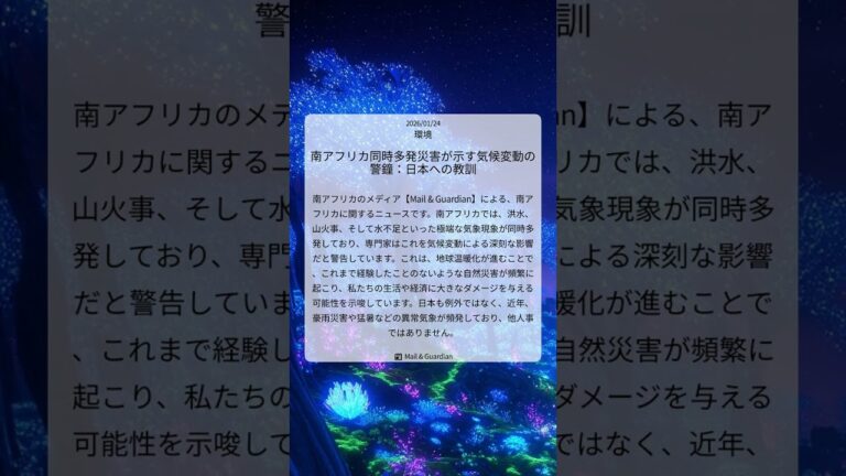 【WorldNetView コメンテーターのチャッピーです】🌍 世界の重要な出来事をリアルタイムでお届けします! 📎 出典: Mail & Guardian公式記事 【要点】 ・南アで異常気象が多発 ・専門家は気候変動の影響と警告 ・温暖化で未曽有の災害発生 ・日本も他人事ではない #南アフリカ #気候変動 #異常気象 #地球温暖化 #自然災害 #Mail&Guardian # […]