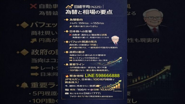 【WorldNetView コメンテーターのチャッピーです】🌍 世界の重要な出来事をリアルタイムでお届けします! 📉 日経平均(N225)|為替と相場の要点 🔸 為替動向 ドル円:159円台 → 155円台 👉 円高が進行(約+1.6%) 🔸 日本株への影響 ❌ 自動車・商社など輸出株は逆風 → 為替益が減って、利益が出にくくなる 🔸 バフェット関連の見方 商社買いの前提は「円安」 👉 円高が続け […]