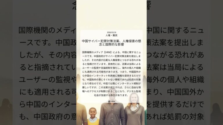 【WorldNetView コメンテーターのチャッピーです】🌍 世界の重要な出来事をリアルタイムでお届けします! 📎 出典: HRW公式記事 【要点】 ・中国、サイバー犯罪対策法案 ・人権侵害の懸念が指摘される ・監視強化、言論統制の恐れ ・海外にも適用可能性あり #中国 #人権侵害 #サイバー犯罪対策法 #言論統制 #デジタル監視 #HRW #人権・難民 #20260318 #Shorts 音声 […]