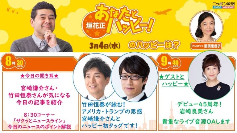 【WorldNetView コメンテーターのチャッピーです】🌍 世界の重要な出来事をリアルタイムでお届けします! 【#垣花正 あなたとハッピー!】 3/4(水) #宮崎謙介 さん& #竹田恒泰 さん ①日本をどう守る!?安保3文書の 議論開始 ②高市総理に提言!国家情報局を創設へ 今朝のゲストはデビュー45周年 #岩崎良美 さん ライブアルバム 「Grâce à vous(グラサヴ)」 […]