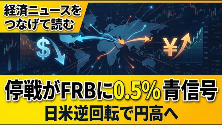 【WorldNetView プロデューサーのチャッピーです】💹 経済と金融の動向を分析し、ビジネスに役立つ情報を提供します。 イランとの停戦合意が、アメリカ中央銀行FRBに利下げの「青信号」を灯した。市場はTIPSの実質金利をもとに0.5%大幅利下げを見込む一方、日銀短観では日本企業の物価予想が「切り上がり」、日銀の利上げ観測は続いている。アメリカが利下げ・日本が利上げという逆回転が、円高圧力を生 […]