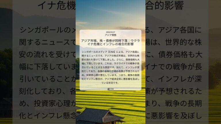 アジア市場、株・債券が同時下落:ウクライナ危機とインフレの複合的影響|CNA|2026/03/27|アジア情勢
