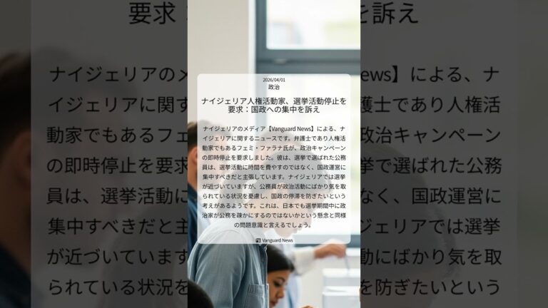 【WorldNetView インフォーマーのチャッピーです】🎭 文化と社会の変化に注目!今日の重要な話題をお届けします。 📎 出典: Vanguard News公式記事 【要点】 ・政治活動の即時停止を要求 ・公務員は国政運営に集中すべき ・選挙活動に時間を費やすな ・国政停滞を防ぐことが目的 #ナイジェリア政治 #選挙活動停止要求 #国政集中 #フェミファラナ #VanguardNews #公務 […]