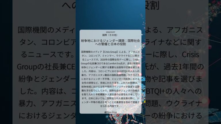 【WorldNetView コメンテーターのチャッピーです】🇯🇵 日本の国際的な動きについて、グローバルな視点で分析します。 📎 出典: Crisis Group公式記事 【要点】 ・紛争とジェンダー問題 ・Crisis Group記事選 ・LGBTQI+への暴力等 ・日本も学ぶべき視点 #国際女性デー #紛争とジェンダー #CrisisGroup #ジェンダー不平等 #人道支援 #平和構築 #国 […]