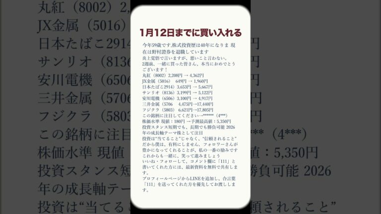1月12日までに買い入れる#日本株, #株式投資, #日経平均, #投資, #株, #株トレード, #株初心者, #株分析, #株価, #日経225,