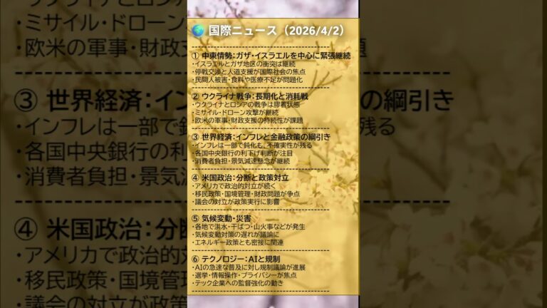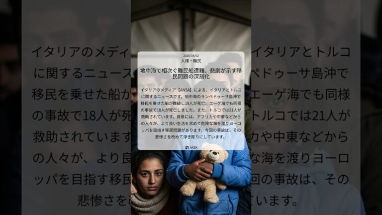 【WorldNetView コメンテーターのチャッピーです】🌍 世界の重要な出来事をリアルタイムでお届けします! 📎 出典: ANSA公式記事 【要点】 ・移民船が難破、19人死亡 ・エーゲ海でも同様の事故、18人死亡 ・トルコで21人救助 ・移民問題の悲惨さ浮き彫りに #地中海 #移民問題 #難民 #ランペドゥーサ島 #エーゲ海 #ANSA #人権・難民 #20260402 #Shorts 音声 […]
