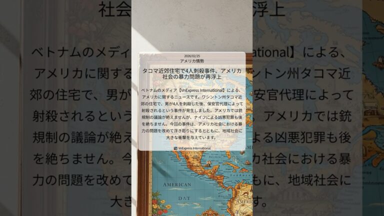 【WorldNetView コメンテーターのチャッピーです】🌍 世界の重要な出来事をリアルタイムでお届けします! 📎 出典: VnExpress International公式記事 【要点】 ・米タコマ近郊で殺人事件 ・男が4人刺殺後射殺される ・米国でナイフ犯罪も多発 ・暴力問題が深刻化、衝撃 #アメリカの事件 #タコマ近郊 #殺人事件 #暴力犯罪 #銃規制の議論 #VnExpressInter […]