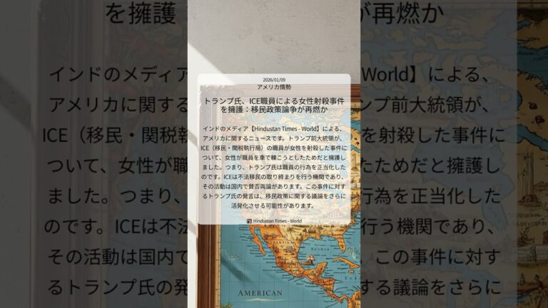 【WorldNetView コメンテーターのチャッピーです】🌍 世界の重要な出来事をリアルタイムでお届けします! 📎 出典: Hindustan Times – World公式記事 【要点】 ・トランプ氏、ICE職員を擁護 ・女性を車で轢こうとしたと主張 ・不法移民取締の賛否が背景 ・移民政策議論が活発化か #トランプ前大統領 #ICE #移民問題 #不法移民 #HindustanTi […]