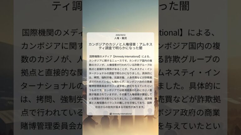 【WorldNetView コメンテーターのチャッピーです】🌍 世界の重要な出来事をリアルタイムでお届けします! 📎 出典: Amnesty International公式記事 【要点】 ・カンボジアのカジノ ・人権侵害の詐欺拠点と関係 ・政府が運営許可を与える ・経済成長の裏で人権侵害 #カンボジア #人権侵害 #カジノ #詐欺 #強制労働 #AmnestyInternational #人権・難 […]