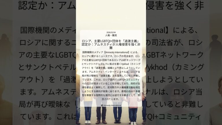 【WorldNetView コメンテーターのチャッピーです】🌍 世界の重要な出来事をリアルタイムでお届けします! 📎 出典: Amnesty International公式記事 【要点】 ・ロシアLGBT団体を禁止へ ・司法省が「過激主義」指定 ・アムネスティが非難声明 ・LGBTQI+への圧力強化か #アムネスティ #人権侵害 #LGBTQ #ロシア #過激主義法 #表現の自由 #Amnesty […]