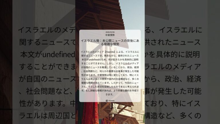 【WorldNetView コメンテーターのチャッピーです】🌍 世界の重要な出来事をリアルタイムでお届けします! 📎 出典: Haaretz公式記事 【要点】 ・Haaretzがイスラエル報道 ・ニュース本文はundefined ・政治、経済、社会問題か ・中東情勢を反映か #イスラエル #Haaretz #中東情勢 #国際ニュース #政治経済 #社会問題 #中東情勢 #20260206 #Sho […]