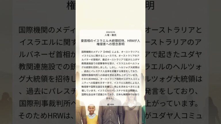 【WorldNetView コメンテーターのチャッピーです】🌍 世界の重要な出来事をリアルタイムでお届けします! 📎 出典: HRW公式記事 【要点】 ・豪首相がイスラエル大統領を招待 ・大統領の過去の発言に批判の声 ・HRWは豪政府に人権侵害非難を要求 ・イスラエル・パレスチナ問題は国際的 #オーストラリア #イスラエル #パレスチナ #人権侵害 #国際法違反 #HRW #人権・難民 #2026 […]