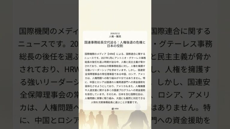 【WorldNetView コメンテーターのチャッピーです】🌍 世界の重要な出来事をリアルタイムでお届けします! 📎 出典: HRW公式記事 【要点】 ・国連事務総長交代迫る ・人権と民主主義が脅威 ・大国の姿勢に懸念あり ・日本は人権重視の選択を #国連事務総長 #アントニオ・グテーレス #人権擁護 #HRW #国連安保理 #国際社会の責任 #人権・難民 #20260212 #Shorts 音声 […]