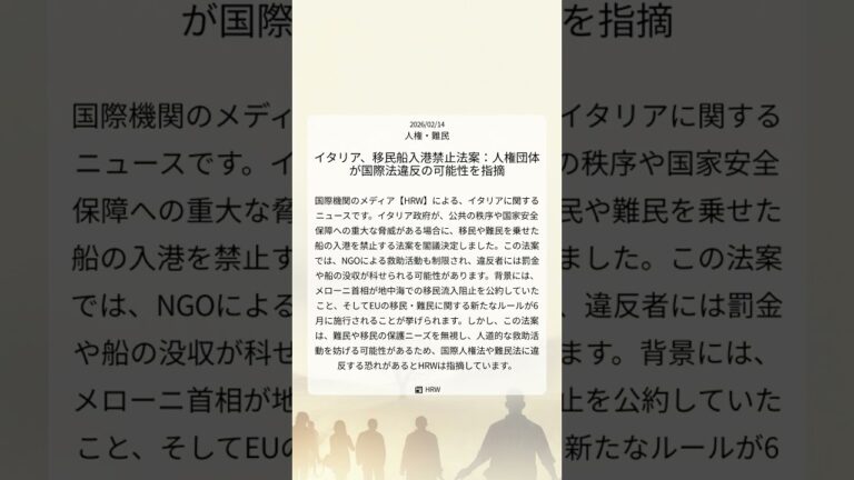 【WorldNetView コメンテーターのチャッピーです】🌍 世界の重要な出来事をリアルタイムでお届けします! 📎 出典: HRW公式記事 【要点】 ・伊政府、移民船入港禁止法案 ・NGO救助活動制限、罰金も ・メローニ首相の公約が背景 ・HRW、国際法違反の恐れ指摘 #イタリア #移民問題 #難民問題 #人道危機 #国際人権法 #HRW #人権・難民 #20260214 #Shorts 音声: […]