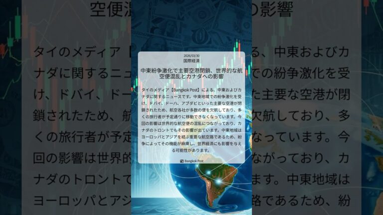 【WorldNetView コメンテーターのチャッピーです】🌍 世界の重要な出来事をリアルタイムでお届けします! 📎 出典: Bangkok Post公式記事 【要点】 ・中東紛争で空港閉鎖 ・航空便が多数欠航 ・カナダにも影響波及 ・世界経済への懸念も #中東危機 #航空便欠航 #世界経済影響 #BangkokPost #トロント #旅行困難 #国際経済 #20260330 #Shorts 音声 […]